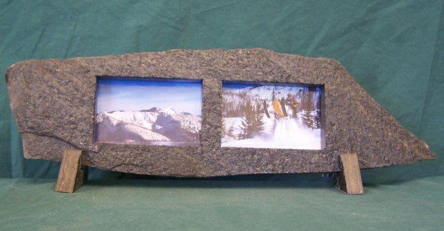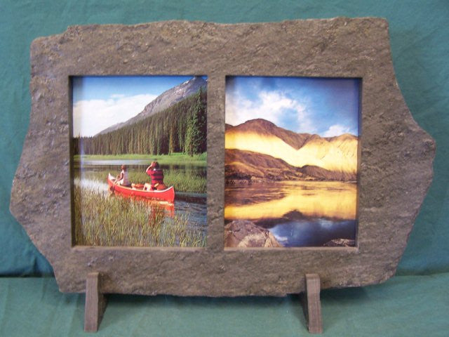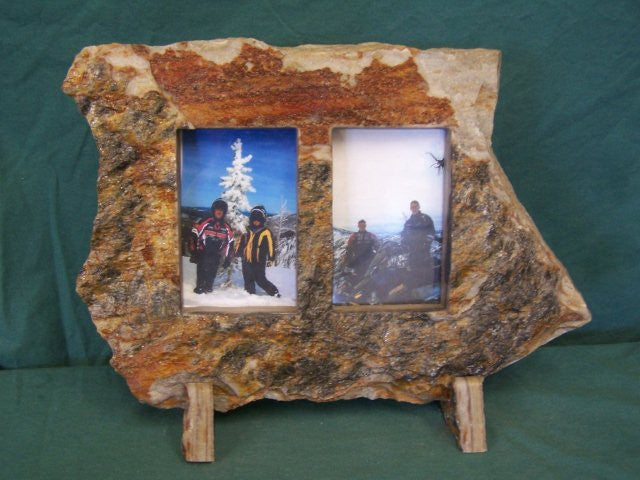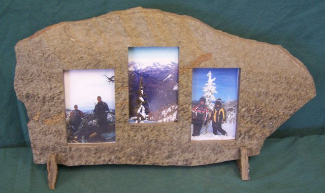 Natural quartzite picture frame with multiple openings sitting on rock legs.